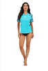 Women's short sleeve swim tops with built-in bra, side pockets, UPF50+ sun protection and quick dry features, having various expressions, including types like rashguard and tankini.